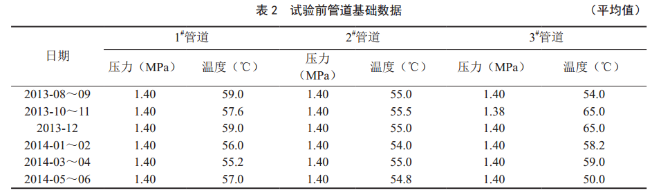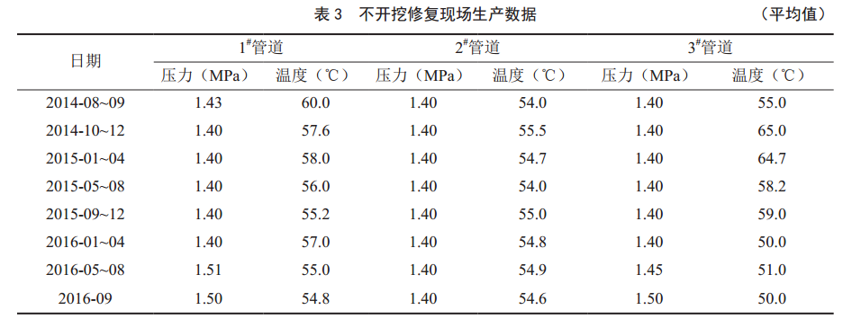 根據內翻襯玻璃鋼軟管修復技術(shù)原理,完成3條摻水管道不開(kāi)挖修復施工(圖 4)。經(jīng)運行25個(gè)多月,管道日常生產(chǎn)運行平穩,平均摻水壓力保持在0.1 MPa正常波動(dòng),從現場(chǎng)實(shí)際生產(chǎn)數據可以看出不開(kāi)挖修復內襯軟管能夠滿(mǎn)足油田生產(chǎn)需求(表 3)。