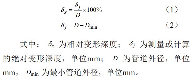 根據GB/T 30582―2014《基于風(fēng)險的埋地鋼質(zhì)管道外損傷檢驗與評價(jià)》,按照深度準則,變形管道的相對變形深度不超管道外徑的6%,其計算公式如下:
