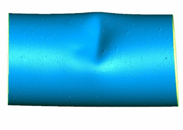 對三處凹陷變形管段的表面進(jìn)行清潔處理,利用掃描精度為0.02 mm的手持三維激光掃描儀分別對三處凹陷管段進(jìn)行表面形貌掃描,保存相關(guān)點(diǎn)、線(xiàn)、面、體等模型數據信息,生成各自的三維模型。圖 3為凹陷1三維激光掃描形貌圖。