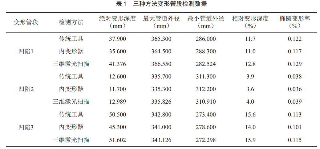 分析以上對比結果,三維激光掃描技術(shù)檢測的凹陷相對變形深度和橢圓變形率數值都比較大,是因為三維激光掃描得到的凹陷三維模型是高精度還原現場(chǎng)實(shí)際形貌,計算數據準確;而傳統工具由于人為因素的影響,檢測數據存在一定誤差無(wú)法避免,內變變形器由于機械振動(dòng)和其它技術(shù)問(wèn)題等,所得檢測數據誤差相對較大。所以,三維激光掃描技術(shù)在三種變形管道檢測方法中精度最高。