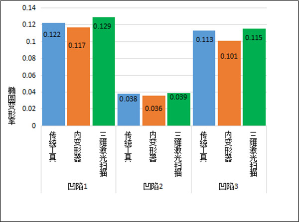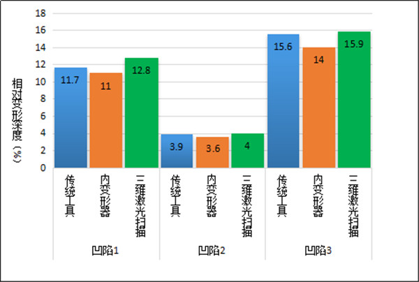 將分別采用傳統工具、內變形器和三維激光掃描三種檢測方法得到的三處凹陷相對變形深度進(jìn)行對比,如圖 6所示?梢钥吹饺S激光掃描得到的每處凹陷相對變形深度最大,傳統工具檢測的次之,內變形器檢測的最小。