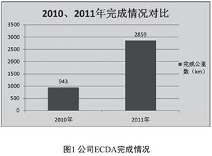 2010年公司完成了烏蘭管道400km, 西二線(xiàn)甘肅段270km, 鄯烏線(xiàn)、 阿獨線(xiàn)、 輪庫氣線(xiàn)、 復線(xiàn)、 庫鄯線(xiàn)共273km, 共計943kmECDA檢測。2011年公司完成了鄯烏線(xiàn)、 輪庫復線(xiàn)、 輪庫氣線(xiàn)、 吐哈分輸支線(xiàn)、 哈密支線(xiàn)、 烏石化進(jìn)油支線(xiàn)、 柳園分輸支線(xiàn)、 玉門(mén)分輸支線(xiàn)、 酒泉分輸支線(xiàn)、 張掖分輸支線(xiàn)、 武威分輸支線(xiàn)、 蘭州末站混油支線(xiàn)、 蘭州末站成品油干線(xiàn)、 克-703-獨線(xiàn)、烏蘭原油管道、 西二線(xiàn)新疆段200km、 獨山子石化支線(xiàn)、 烏魯木齊石化支線(xiàn)、 王家溝支線(xiàn)共計2859km管道ECDA檢測。 2010、 2011年, 公司總共完成ECDA檢測3802km。 見(jiàn)圖1。