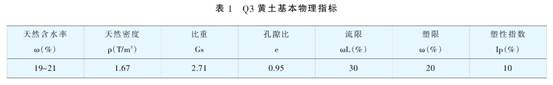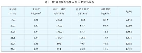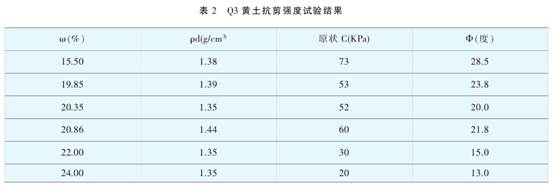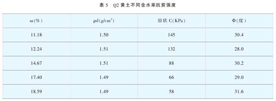 神木縣楊家畔坡村腰觀(guān)Q4黃土厚度約1m,Q3黃土厚度約15m,Q2厚度約10m,Ql黃土在溝底露頭3m。管道在腰觀(guān)r敷設長(cháng)度約60m ,理深約1.2m通過(guò)對該腰觀(guān)Q3和Q2黃土在不同含水率條件下的土樣進(jìn)行r物理力學(xué)性質(zhì)試驗,Q3和Q2黃土基本物理指標、其不同含水率的抗剪強度、結構強度。和干密度pd的變化關(guān)系見(jiàn)表1-5。