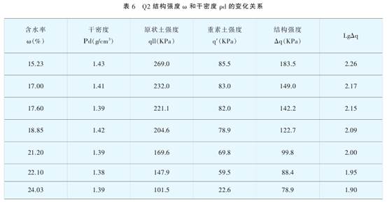 試驗結果表明Q3,Q2黃土結構強度和抗剪強度與土壤含水率ω。非常密切,由表2可見(jiàn),Q3黃土的抗剪強度隨含水率增加而降低,當土樣含水率由15.5 %增加到24%時(shí),原狀土樣凝聚力(:值由73kPa降低到20kPa,內摩擦角Φ值由28.5°降到13.0°,由表3可見(jiàn),Q3黃土結構強度隨土壤含水率的增大而急劇降低,土樣含水率由14.0%增加到24%,其結構強度由138.6kPa減小到40.0kPa,土樣平均含水率每增加1%時(shí)其結構強度降低約10kPa;由表5可見(jiàn),Q2黃土的抗剪強度隨含水率增加而顯著(zhù)降低,當土樣含水率由11.18%增加到23.9%時(shí),原狀土樣凝聚力C值由145kPa降低到24kPa,內摩擦角Φ值由30.40降到19.4°,由表6可見(jiàn),Q2黃土結構強度隨土壤含水率的增大而急劇降低,土樣含水率由15.23%增加到24.03 %,其結構強度由183.5kPa減小到78.9kPa ,土樣平均含水率每增加1%時(shí)其結構強度降低約12kPa。