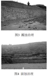 濺蝕易造成管道穿越邊坡以及臺田地邊緣局部的坍塌, 嚴重時(shí)會(huì )造成管道裸露的發(fā)生。 目前治理措施是, 高陡邊坡區域分級夯填, 形成梯田狀, 管道穿越臺田地邊緣采用2:8灰土進(jìn)行夯實(shí), 修建椽幫堰。 濺蝕較嚴重地段采用修建漿砌石擋土墻的措施。 如圖3、 4對梯田、 邊坡修建漿砌石擋土墻防止濺蝕、 面蝕的發(fā)生。