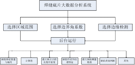 (1) 包括焊片信息輸入、焊縫數字圖像數據庫、圖像亮度對比處理、圖像保存、圖像像素尺寸識別、邊緣檢測、閾值分析、色階處理、圖像執行變換、黑白像素統計、反相處理、焊縫數字圖像處理等模塊。