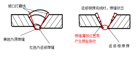 返修時(shí),應根據探傷照片及實(shí)際缺陷分析情況,合理選擇返修打磨狀態(tài),以防止未焊透、未熔合、夾渣等缺陷產(chǎn)生。