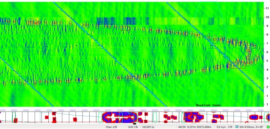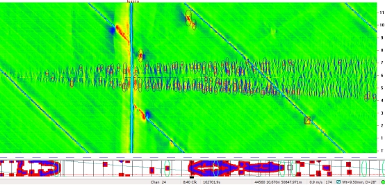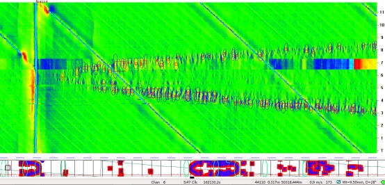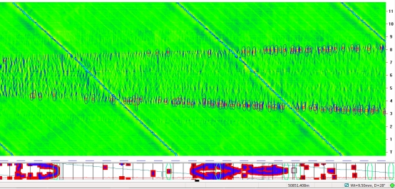 (2)位于首站出站50 890.035 m處前后,內檢測信號顯示連續6根管節存在1 072處內腐蝕缺陷,且缺陷的時(shí)鐘分布特征也顯示為積水腐蝕。其下游的44620-44670段6根管節44 m范圍內也存在532處內腐蝕缺陷,且內腐蝕均分布在5:00~7:00時(shí)鐘范圍內。與50 322 m處的內腐蝕類(lèi)似,該管段也呈現出較典型的建設期試壓水導致的內腐蝕特征。內檢測信號部分截圖如圖2所示。