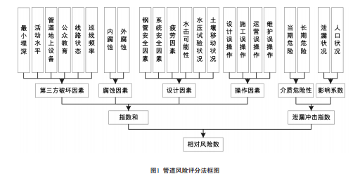 當前,用于管道風(fēng)險評價(jià)比較完整的方法為W.Kent Muhlbauer所提出的評分法,如圖1所示。其中“第三方破壞、腐蝕原因、設計原因、操作原因”評分的“指數和” 是表示管道事故發(fā)生的概率,由“介質(zhì)危險性、影響系數”決定的“泄漏沖擊指數”是表示管道事故的損失。