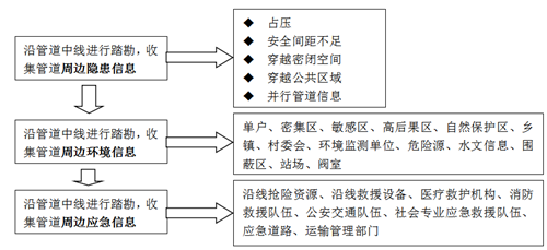確定中心線(xiàn)后,對需采集數據進(jìn)行分析分解。管道屬性數據從設計資料、運營(yíng)單位維護資料中得到;管道檢測維護數據由運營(yíng)方提供;管道環(huán)境數據,針對多樣性和時(shí)效性將其分為“管道周邊隱患信息”、“管道周邊環(huán)境信息”及“管道周邊應急信息”,并對各大類(lèi)進(jìn)行細分,設計相關(guān)表格,統一標準,以達到信息收集的統一性。見(jiàn)圖1、圖2。