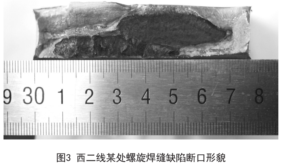 例如,2015年5月,公司開(kāi)展西二線(xiàn)某段焊縫風(fēng)險排查過(guò)程中發(fā)現某處螺旋焊縫存在裂紋缺陷。該缺陷由公司科技信息服務(wù)中心內檢測發(fā)現,經(jīng)第三方完整性評價(jià),為不可接受,公司即對缺陷部位進(jìn)行了換管處置。后期,又委托專(zhuān)業(yè)單位對缺陷開(kāi)展了失效分析,發(fā)現該焊縫裂紋擴展深度達15mm,剩余壁厚僅4mm,F場(chǎng)水壓試驗及斷口形貌如圖2、圖3所示。