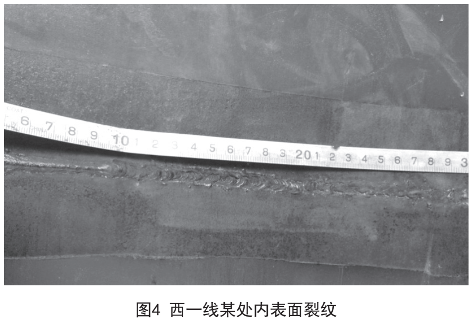 2016年6月,公司開(kāi)展西一線(xiàn)某段焊縫失效風(fēng)險排查中發(fā)現某處環(huán)焊縫存在內表面裂紋缺陷。換管取樣后確認該處焊縫內表面存在裂紋、根部未熔合缺陷,如圖4所示。