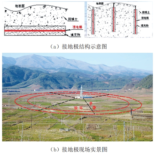 如圖3所示,接地極由電極(饋電棒)、導流系統、輔助設施等構成,型式主要有水平單環(huán)型、水平雙環(huán)型、垂直型和深井型。接地極雖然在工程中有明顯的優(yōu)勢,但也存在地面跨步電壓過(guò)大、本體腐蝕、對電力系統交流變壓器偏磁影響和對地下金屬管道腐蝕影響等問(wèn)題。