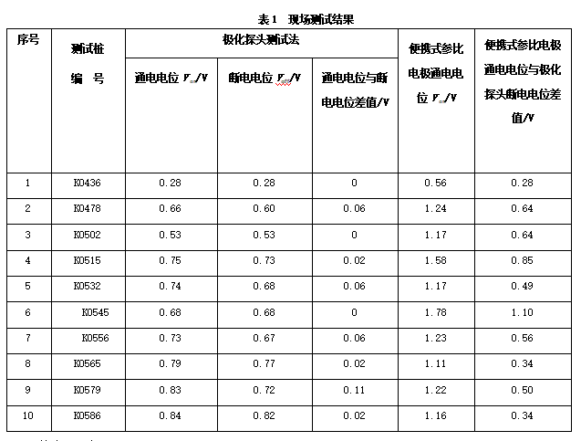 用極化探頭對西南片區某管段陰極保護效果進(jìn)行了現場(chǎng)測試。該管段地處城市周邊,陰極保護方式為外加強制電流和犧牲陽(yáng)極相結合。周?chē)休^多電氣化鐵路、高壓輸電塔、銅礦廠(chǎng),受雜散電流的干擾比較嚴重。用極化探頭和便攜式參比電極測量的電位見(jiàn)表1。