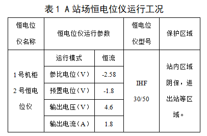 首先對A站場(chǎng)恒電位儀的運行狀況,包括運行模式、輸出電流、輸出電壓、參比電位、預置電位等參數進(jìn)行了檢測,結果見(jiàn)表1。