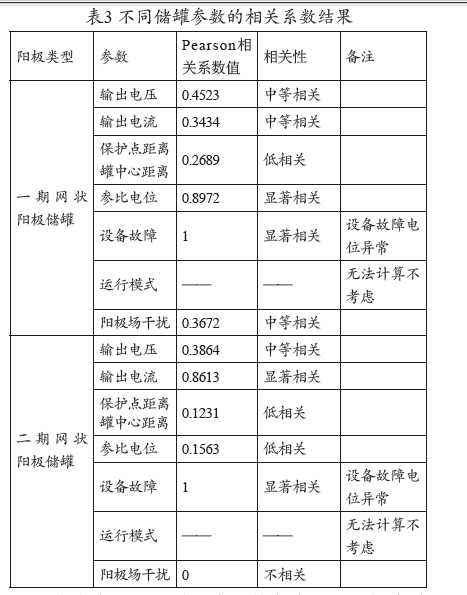 因儲備庫陰保系統陽(yáng)極分成深井陽(yáng)極和網(wǎng)狀陽(yáng)極陰保系統,我們將相關(guān)性分析按照兩組進(jìn)行,根據各個(gè)參數分別計算Pearson相關(guān)系數,結果見(jiàn)表3。