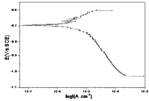 對極化曲線(xiàn)進(jìn)行擬合,碳鋼在污水中的自腐蝕電位為-697.53mv,腐蝕電流密度為4.76×10-6A/ cm2,轉換成腐蝕速率約為0.56mm/a。