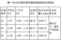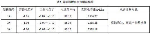 實(shí)際電容量和電流效率是衡量鋁合金犧牲陽(yáng)極的重要參數。經(jīng)測試,犧牲陽(yáng)極的實(shí)際電容量及電流效率如下表。