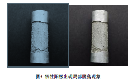 從表4中可以明顯看出,試驗用犧牲陽(yáng)極電流有效率均大于85%,材料合格。另外,鋁合金材料作為犧牲陽(yáng)極時(shí),要求腐蝕均勻,以免有大塊的陽(yáng)極脫落,影響陽(yáng)極的使用效率和使用壽命。經(jīng)試驗,3支陽(yáng)極試樣中的1支出現局部脫落現象(見(jiàn)圖3),使用過(guò)程中可能影響陽(yáng)極的使用效率和使用壽命。