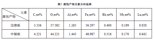 從表5可以看出,在腐蝕產(chǎn)物中,質(zhì)量百分比較大的是Fe、O兩種元素,兩中元素占總量的90% 以上,故腐蝕產(chǎn)物的成分主要是鐵的氧化物。