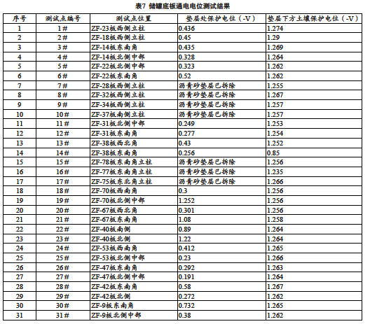 通過(guò)儲罐底板整體陰極保護現狀調查,認為儲罐底板與墊層下方土壤電位值能夠滿(mǎn)足GB-T21448-2008《埋地鋼質(zhì)管道陰極保護技術(shù)規范》要求。但在測試過(guò)程中發(fā)現,儲罐底板整體與瀝青砂墊層未良好接觸,所以現場(chǎng)測試的電位僅為距參比電極最近的儲罐底板與墊層有良好接觸部位的電位。同時(shí),由于儲罐底板與瀝青砂墊層間存在較大空隙,陰極保護電流無(wú)法均勻流入儲罐底板外側, 故儲罐底板外側并未得到有效的陰極保護。