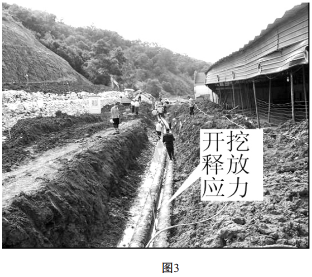 根據現場(chǎng)的監測, 如果坡面的裂縫不斷擴大, 滑坡體有進(jìn)一步下滑的趨勢, 為了盡快釋放管道的推應力作用, 需在管道前約3米處臨時(shí)打一排鋼管樁(見(jiàn)圖 2) , 并在輸油管道(靠近坡體一側) 進(jìn)行開(kāi)挖釋放應力(見(jiàn)圖 3) 。 過(guò)程可采用機械配合人工開(kāi)挖, 并注意要保護光纜和防腐保護層不受破壞。 在成品油管道彈性形變恢復后, 回填松散狀砂土, 保護管道。
