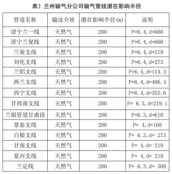 蘭州輸氣分公司管轄管線(xiàn)不存在表1中c、 d類(lèi)情況,管線(xiàn)的潛在影響半徑均為200m,見(jiàn)表2。