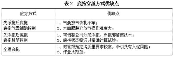 針對底拖穿越技術(shù),主要有先浮拖后底拖、底拖氣囊輔助控制;先浮拖后底拖、底拖解筒控制和全程底拖等方式(見(jiàn)表2)。