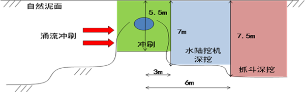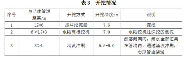 根據船舶設備作業(yè)特點(diǎn)和機械性能,采取抓斗、水陸挖機、涌流沖刷相結合的管底挖泥、清淤方案,用多波束檢測管溝開(kāi)挖深度,潛水員水下探摸已建管道底部?jì)艨臻g。開(kāi)挖情況見(jiàn)表3,開(kāi)挖區域見(jiàn)圖7。