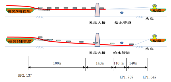 遵循“浮拖預制全段,底拖一次性穿越”工藝設計原則。①鋪管船位于水管西側240 m,牽引船位于水管東側250 m,均原地拋錨;②鋪管船組對焊接,牽引船卷?yè)P機牽引海管入水,并浮拖,當浮拖至供水管線(xiàn)前10 m時(shí),停止浮拖。由鋪管船往西敷設120 m管線(xiàn);③進(jìn)行牽引纜繩的水面置換,完成浮拖轉底拖牽引;④前200 m管線(xiàn)通過(guò)跳躍式解筒,達到懸浮狀態(tài),實(shí)現水平底拖;⑤高潮平流期開(kāi)始底拖,牽引駁船不動(dòng)、卷?yè)P機收纜、張緊器夾緊、鋪管船絞錨東移一次性完成120 m底拖過(guò)程。(見(jiàn)圖8)。