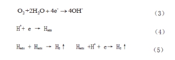 在土壤模擬溶液中,隨極化電位的負移,陰極首先發(fā)生吸氧反應,如式(3)所示;當極化電位達到析氫過(guò)電位時(shí)陰極才會(huì )發(fā)生析氫反應,如式(4)和式(5)所示。由于土壤模擬溶液中的溶解氧含量有限,隨著(zhù)電位的繼續負移,氧的還原電流會(huì )達到氧極限擴散電流密度,陰極主要以析氫電流密度為主。從圖2中三種土壤環(huán)境中的陰極極化曲線(xiàn)可以看出,在-0.9Vvs.SCE電位附近, 存在析氫反應和吸氧反應的轉折拐點(diǎn),在轉折點(diǎn)電位以下,陰極析氫反應占主導作用。因此較負電位下三種土壤環(huán)境中極化曲線(xiàn)的差異,主要是由于同樣的電位下三種環(huán)境中析氫電流密度不同導致的。