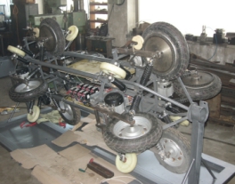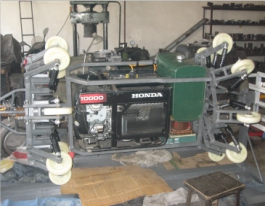 依托伊霍線(xiàn)等新建管道工程研制的自源主動(dòng)運動(dòng)智能牽引系統,成功解決了內檢測器的動(dòng)力源問(wèn)題。該自源主動(dòng)運行智能牽引系統由輪式管道行走動(dòng)力機械結構和自動(dòng)控制系統組成,其中輪式管道行走動(dòng)力機械結構由超輕車(chē)身、八輪行進(jìn)結構、燃油系統支撐結構、電機電瓶系統支撐結構等組成,自動(dòng)控制系統由汽油發(fā)電機控制系統、速度控制系統和供電監測系統等組成。依托于該自源主動(dòng)運行智能牽引系統,成功開(kāi)展了牽引力試驗、爬坡能力試驗(下坡速度控制在1.2 m/s以下)、彎頭能力試驗和工作壽命試驗等,實(shí)現了我國首次空管變徑、弱磁內檢測。