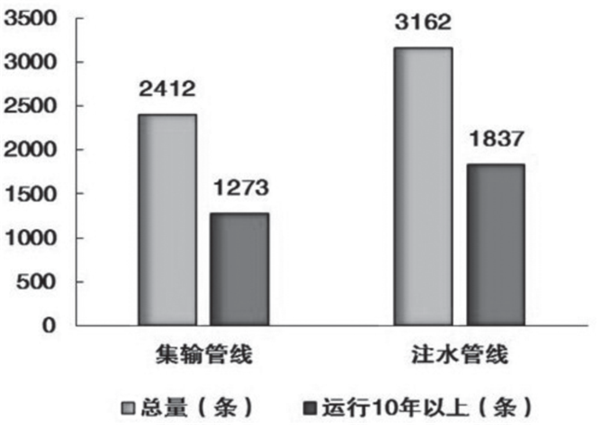 腐蝕泄漏問(wèn)題突出。至2015年6月,全廠(chǎng)范圍內運行10年以上的原油管道和注水管道分別占總量的53%和58.1%(如圖1所示),部分管道已經(jīng)呈現老化腐蝕現象。