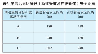 從上表可以看出,確定的安全距離值相比現有標準規范給定的值大很多。這主要是由于管道風(fēng)險可接受標準參考;袠I(yè)確定,對管道行業(yè)來(lái)講,可能過(guò)于嚴格。此外,目前設定的管道中心線(xiàn)兩側各5m的距離,普遍認為保證不了管道周邊的人員安全,其設定的初衷只是為了方便事故后的搶險入場(chǎng)。國內多處管道改線(xiàn)案例也證明了這一點(diǎn):在管道穿過(guò)市鎮的區段,管道兩側雖保證了5m的距離,但由于周邊人口太過(guò)密集,管道企業(yè)與民眾都覺(jué)得風(fēng)險過(guò)高。最后管道企業(yè)進(jìn)行了改線(xiàn),將管道遷出了該區域。