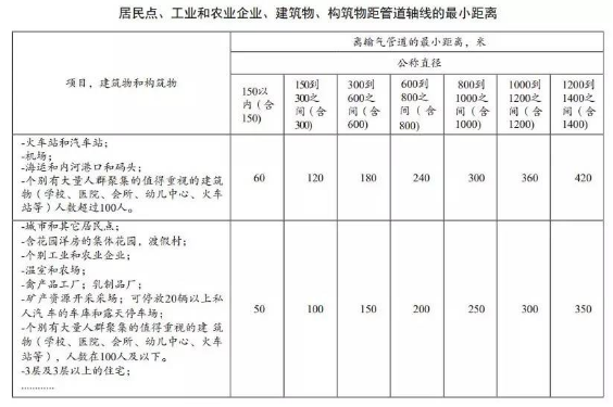 該標準規定了居民點(diǎn)、工業(yè)(農業(yè))企業(yè)、建筑物、構筑物距干線(xiàn)輸氣管道的最小距離(見(jiàn)下表)。其中屬于人口密集的火車(chē)站、汽車(chē)站、機場(chǎng)、學(xué)校、醫院、會(huì )所等(相當于我國標準規定的4級地區)距干線(xiàn)管道的距離,按照管道直徑150—1400毫米等7個(gè)檔次,規定最小距離為60米,最大距離為420米。城市和居民點(diǎn)、3層及3層以上住宅距干線(xiàn)管道的距離,按照管道直徑150—1400毫米等7個(gè)檔次,規定最小距離為50米,最大距離為350米。