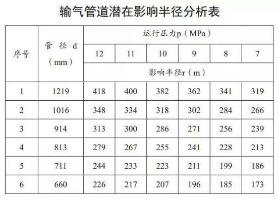 從上表數據可以看出,當管徑為1219毫米,壓力為12MPa時(shí)(如西氣東輸三線(xiàn)等),其潛在影響半徑達到418米。另外,《石油天然氣工程設計防火規范》(GB50183—2004)第7.2.2.1條對油氣田內部原油、天然氣凝液集輸管道與地面建(構)筑物的最小距離規定:與居民區、村鎮、重要公共建筑物不應小于30米,一般建(構)筑物不應小于10米。