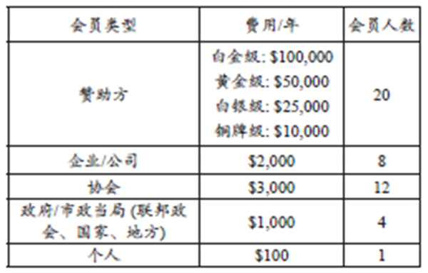 根據會(huì )員類(lèi)型 ,每年會(huì )員的會(huì )費及贊助類(lèi)型由董事會(huì )來(lái)決定。會(huì )員等級和贊助包括以下內容: