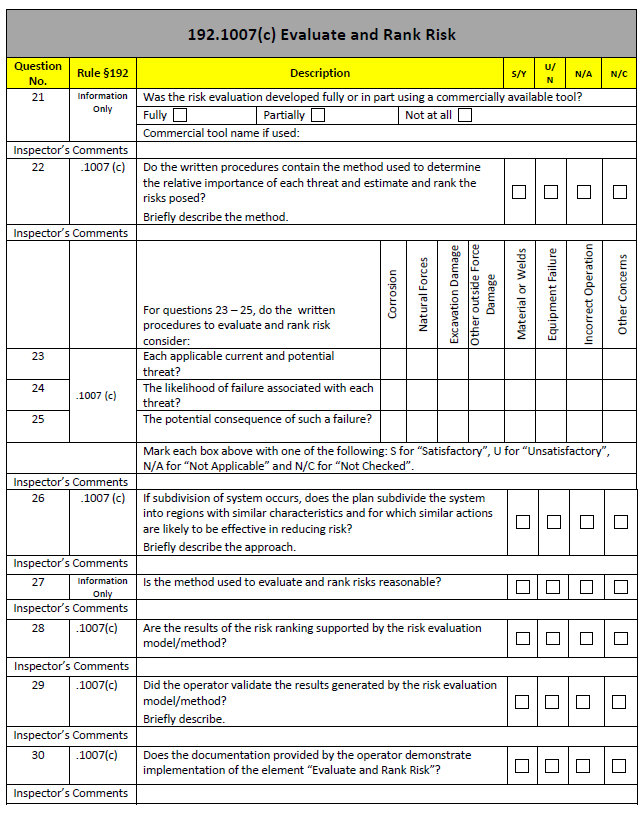 由PHMSA于2011年9月制定和發(fā)布。用于檢查和評價(jià)燃氣運營(yíng)企業(yè)開(kāi)展完整性管理情況,檢查手冊(示例見(jiàn)圖5)以表格和提問(wèn)形式進(jìn)行檢查。對于問(wèn)題的回答有S/Y、U/N和N/A三種形式,其中S/Y表示是或者滿(mǎn)足條件,U/N表示不是或者不滿(mǎn)足條件,N/A表示標準不適用或者未進(jìn)行檢查。燃氣企業(yè)也可利用該檢查手冊進(jìn)行自檢,以完善其完整性管理水平。