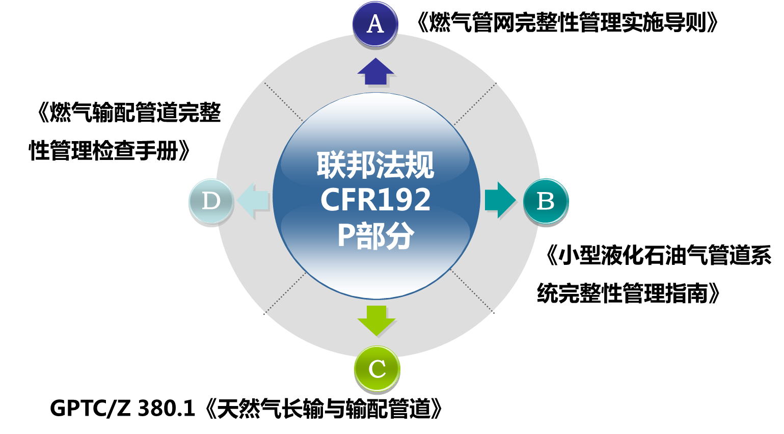 綜上,美國城鎮燃氣管網(wǎng)完整性管理方面的法規標準,以聯(lián)邦法規CFR192 P部分為核心,在該法規的基礎上制定具體的管理規定和審核要求(見(jiàn)圖6)。