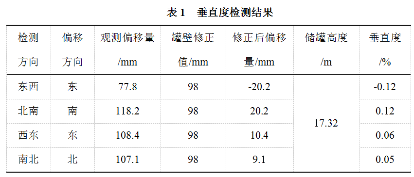 2017年8月24日進(jìn)行了垂直度檢測,利用MS05型全站儀自由設站測量罐體同一垂線(xiàn)頂部及底部的水平距離,觀(guān)測方向為東西、北南、西北、南北四個(gè)方向。以測量?jì)揄敳亢偷撞康木嚯x計算罐體頂部檢測點(diǎn)相對于罐體底部檢測點(diǎn)的傾斜方向,結果見(jiàn)表1。檢測結果符合《油罐的檢驗、修理、改建及翻建》(SY/T 6620―2014) 10.5.2.1 “罐壁頂部相對于罐壁底部的不垂直度不應超過(guò)油罐總高度的1%,但最大為127mm”。