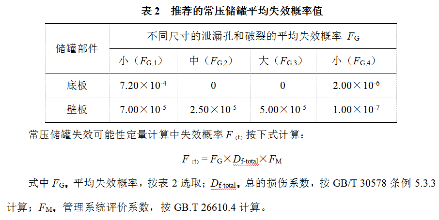 以《無(wú)損檢測 常壓金屬儲罐聲發(fā)射檢測及評價(jià)方法》(JB/T 10764-2007 )規定,按表2選取常壓儲罐底板和壁板的平均失效概率為小、中、大3種泄漏孔和破裂共4種損壞形式出現的概率。