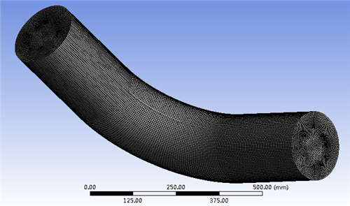 彎管內徑為200 mm,粗糙度0.05mm,中心距305 mm,水為流動(dòng)介質(zhì),網(wǎng)格采用三維六面體網(wǎng)格劃分方式,整個(gè)模型從入口到出口采用掃略方法劃分,網(wǎng)格尺寸為2.0mm,網(wǎng)格節點(diǎn)數為435 305,網(wǎng)格單元為421 360,如圖2所示。
