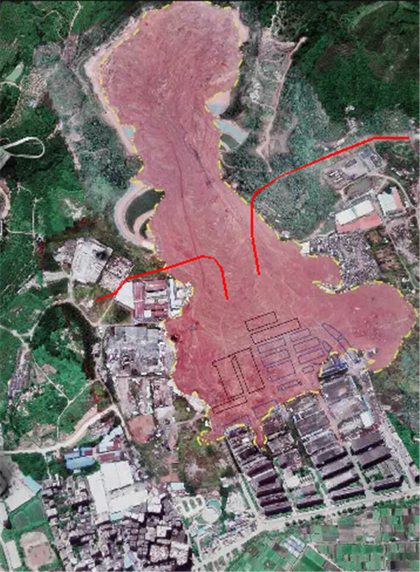 渣土場(chǎng)批復規劃庫容400×104m3,封場(chǎng)標高95 m,事故發(fā)生時(shí)實(shí)際堆填量已達583×104m3,堆填體后緣實(shí)際標高已達160 m,嚴重超庫容、超高堆填,增加了堆填體的下滑推力。加之渣土場(chǎng)地勢南高北低,北側基巖狹窄、凸起,形成了體積龐大的高勢能堆填體。渣土場(chǎng)下游原本修建了攔擋壩和護坡,但在巨大的側向土壓力、并存在下部滑動(dòng)面的作用下,攔擋壩崩潰,超過(guò) 200×104m3渣土傾瀉而下,摧毀了下游33棟樓房,滑坡體掩埋面積超過(guò)10×104m3,滑動(dòng)最遠距離達1 100 m,滑坡體中部掩蓋地面的深度約15~18 m。