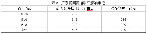 其中,管道潛在影響半徑按下式計算:r=0.099(r—潛在影響半徑,m;d—管段外徑,mm;p—管段最大允許操作壓力,MPa)。根據公式,廣東管網(wǎng)計算出不同管徑下的管道潛在影響半徑(表 2)。