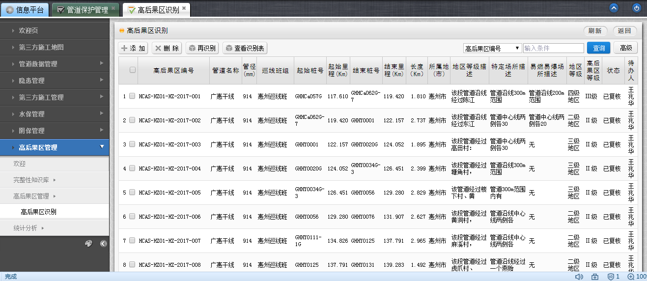 (1)建立高后果區檔案。根據GB 32167-2015要求,對高后果區的管道基礎信息、周邊環(huán)境信息、人口密集場(chǎng)所、特定場(chǎng)所、易燃易爆場(chǎng)所等信息及巡護人員、管理人員信息進(jìn)行登記建檔,定期排查與更新。