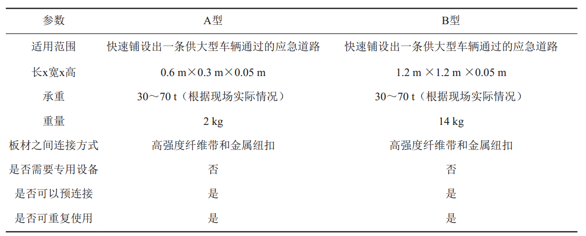 表 1 輕型復合材料快速鋪路板主要參數