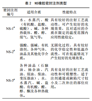 ①NS橡膠密封注劑。為增強注劑對不同工況條件的適應性,在NS橡膠注劑配方的基礎上添加適量的稀土納米材料,以其尺寸效應和化學(xué)活性,在硫化過(guò)程使組分性能得到充分發(fā)揮,使其產(chǎn)生較高的交聯(lián)密度,改善注射工藝流動(dòng)性和對不同工況的適應性。如表 2所示。