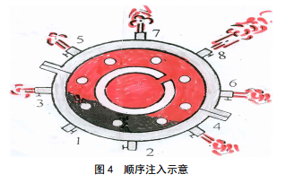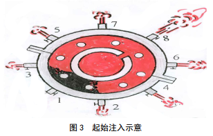(1)起始注入遠離主泄漏點(diǎn)。遠離主泄漏部位開(kāi)始注入,有利于建立穩定的密封結構。隨著(zhù)注劑移動(dòng)距離增長(cháng),推進(jìn)阻力逐漸增大,至相鄰注劑孔時(shí)停止注入,按順序更換注劑孔(圖 3)。