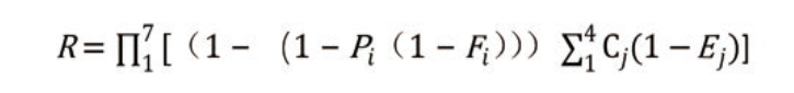 采用評分模型將P1至P7量化為0~1之間,表示發(fā)生概率。評分模型可以參考kent法的指標體系,但必須進(jìn)行優(yōu)化。將F1至F7量化為0~1之間,表示防護措施的效果。從圖 2可以看出, P1至P7為邏輯或關(guān)系。將C1至C4量化為0~1之間,表示失效后果。 將E1至E4量化為0~1之間,表示應急措施的效果。E1至E4為累計關(guān)系。這樣可以建立以下管道風(fēng)險評價(jià)計算公式: