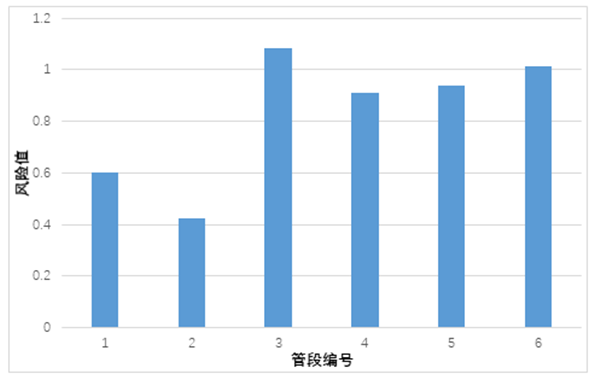 對某輸油管道的一個(gè)站間進(jìn)行實(shí)際應用。管道長(cháng)90 km,輸送汽油,管徑610 mm,設計壓力8 MPa,運行壓力5 MPa。收集分析所需要的數據,將管道最終劃分為6個(gè)管段。隨后對每個(gè)管段進(jìn)行了風(fēng)險計算,結果見(jiàn)圖 3。